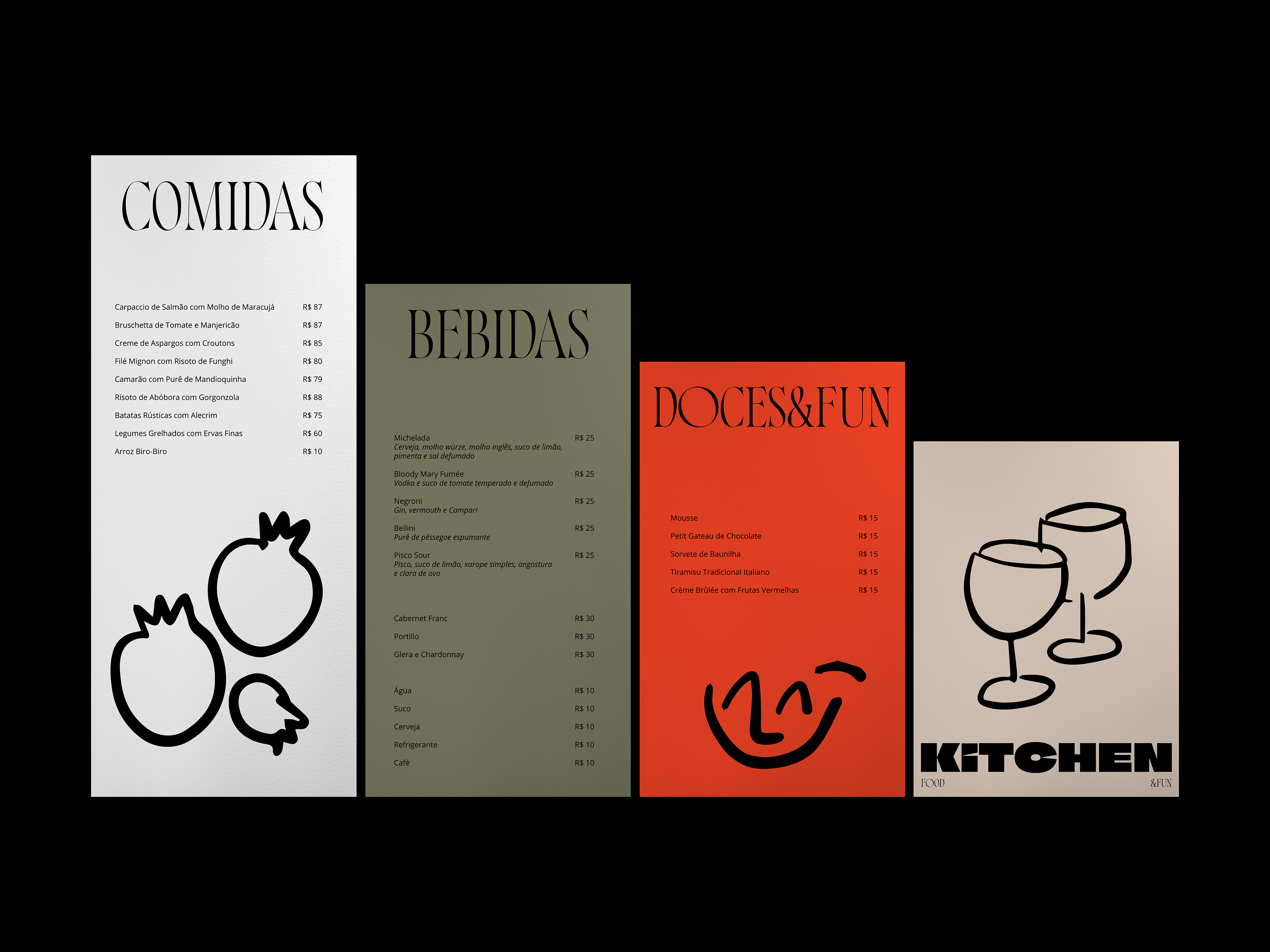 We were invited to create the visual identity for the new Kitchen Fun&Food. The challenge was to create a unique, expressive & modern brand, but its identity should also reflect the highest quality of products & services. We also create menu design and collateral restaurant´s pieces